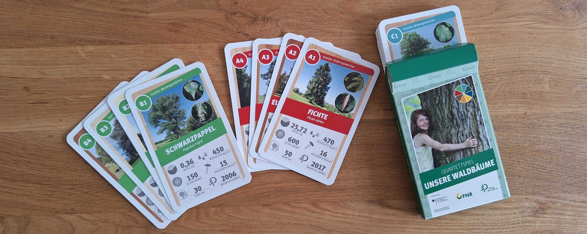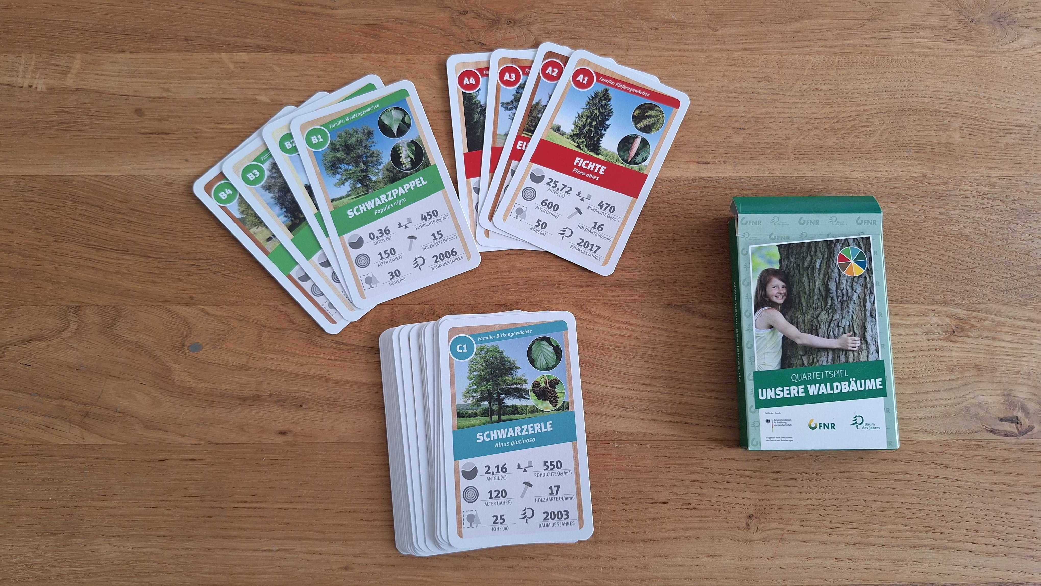 Mit dem Quartettspiel „Unsere Waldbäume“ lernen wir 32 heimische Baumarten kennen. Jede Karte stellt eine Baumart vor und gibt Auskunft über den Baumanteil in Deutschland, das mögliche zu erreichende Alter des Baumes, die maximale Höhe, die Rohdichte und Holzhärte sowie, wenn vorhanden, eine Information darüber wann der Baum schon einmal „Baum des Jahres“ der Dr. Silvius Wodarz Stiftung war. Nach ein paar Spielrunden ist man perfekt informiert über unsere Baumarten.