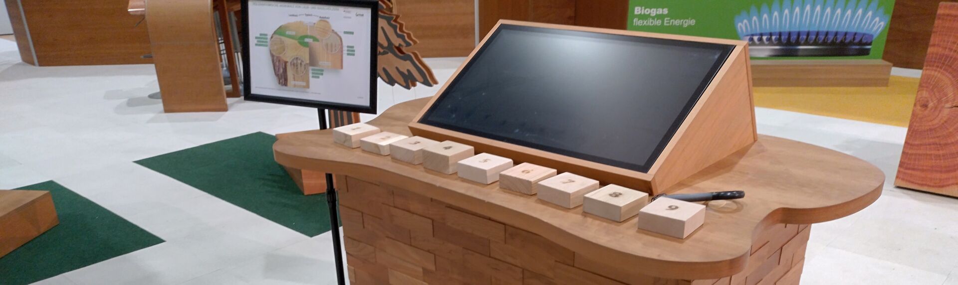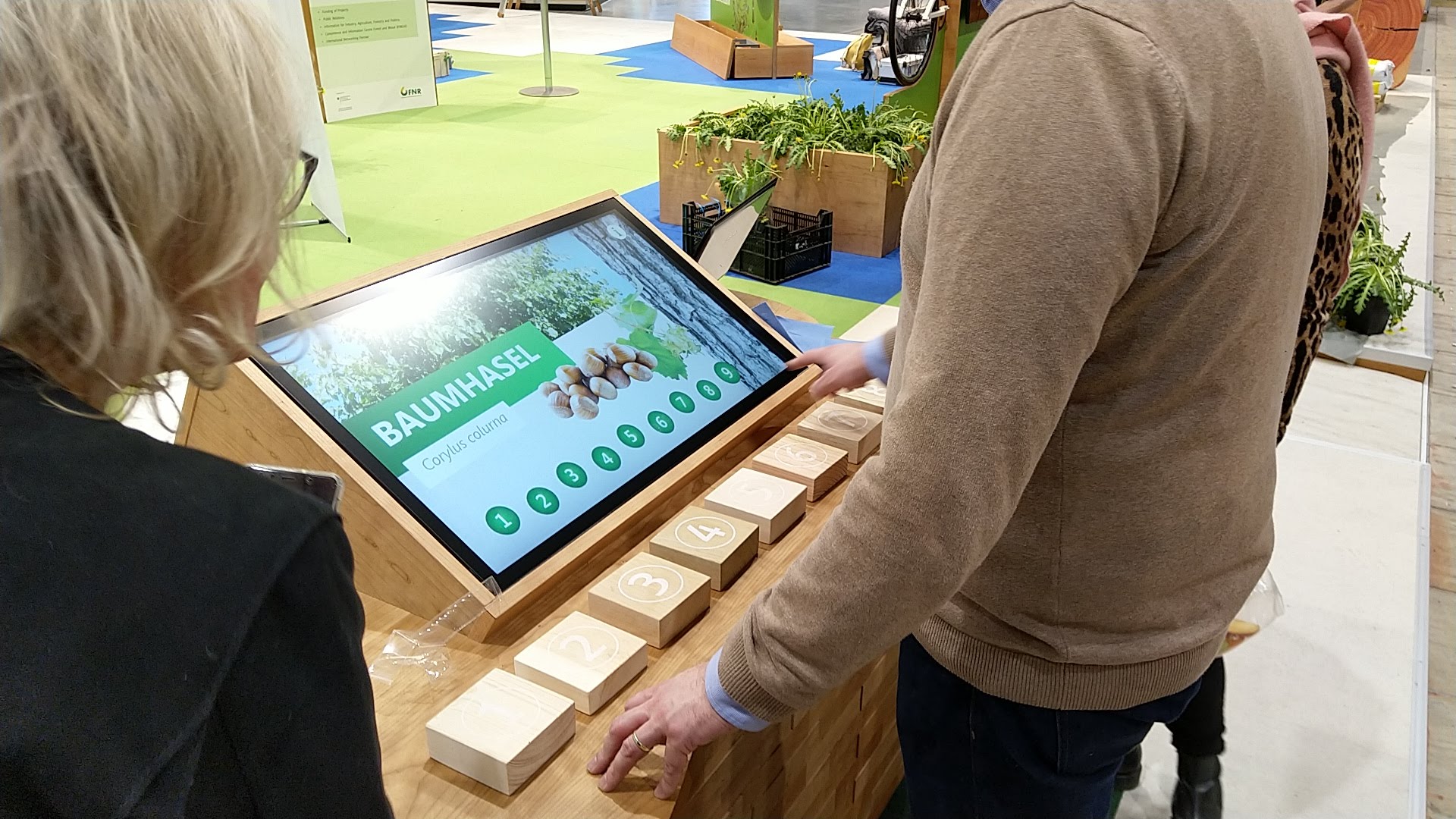 Wie man die häufigsten heimischen Holzarten anschaulich und fühlbar macht, zeigt das Messeexponat „BaumQuiz“ der Fachagentur Nachwachsende Rohstoffe e. V. (FNR). Mittels eines Quiz wählt die jeweilige Holzprobe aus, die man zuvor ausgiebig ertasten kann. Wenn man alle neun Holzarten richtig auswählt, ist man der neue Waldmeister.