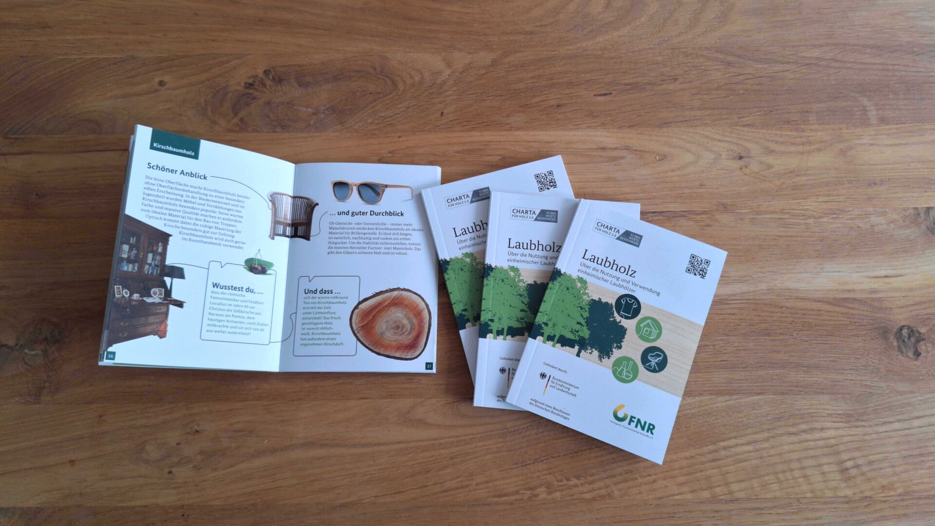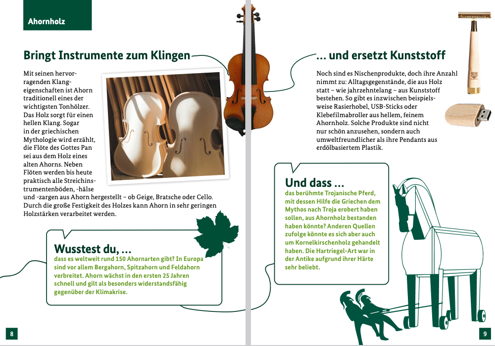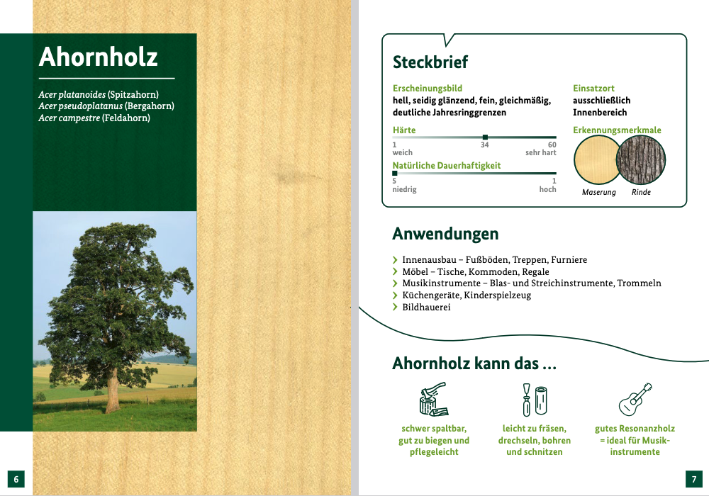 Die Nutzung heimischer Laubhölzer insbesondere für innovative Zwecke ist eine der Zukunftsaufgaben Deutschlands, denn in den kommenden Jahren wird immer mehr Laubholz aus deutschen Wäldern auf den Markt kommen. Die Broschüre „Laubholz – Über die Nutzung und Verwendung einheimischer Laubhölzer“ stellt 12 Baumarten vor und gibt einen Einblick in unterschiedliche Nutzungsformen des jeweiligen Holzes.