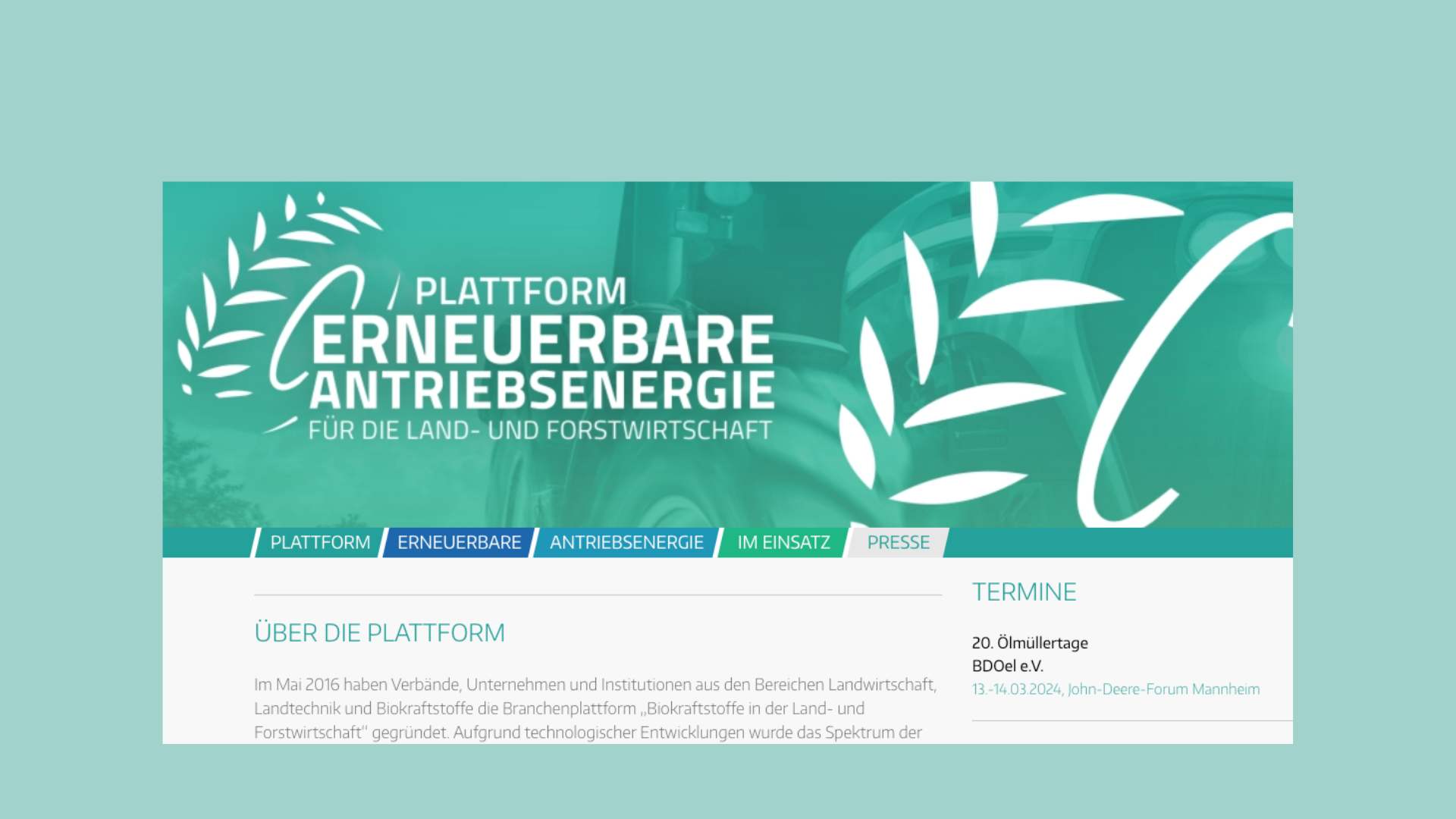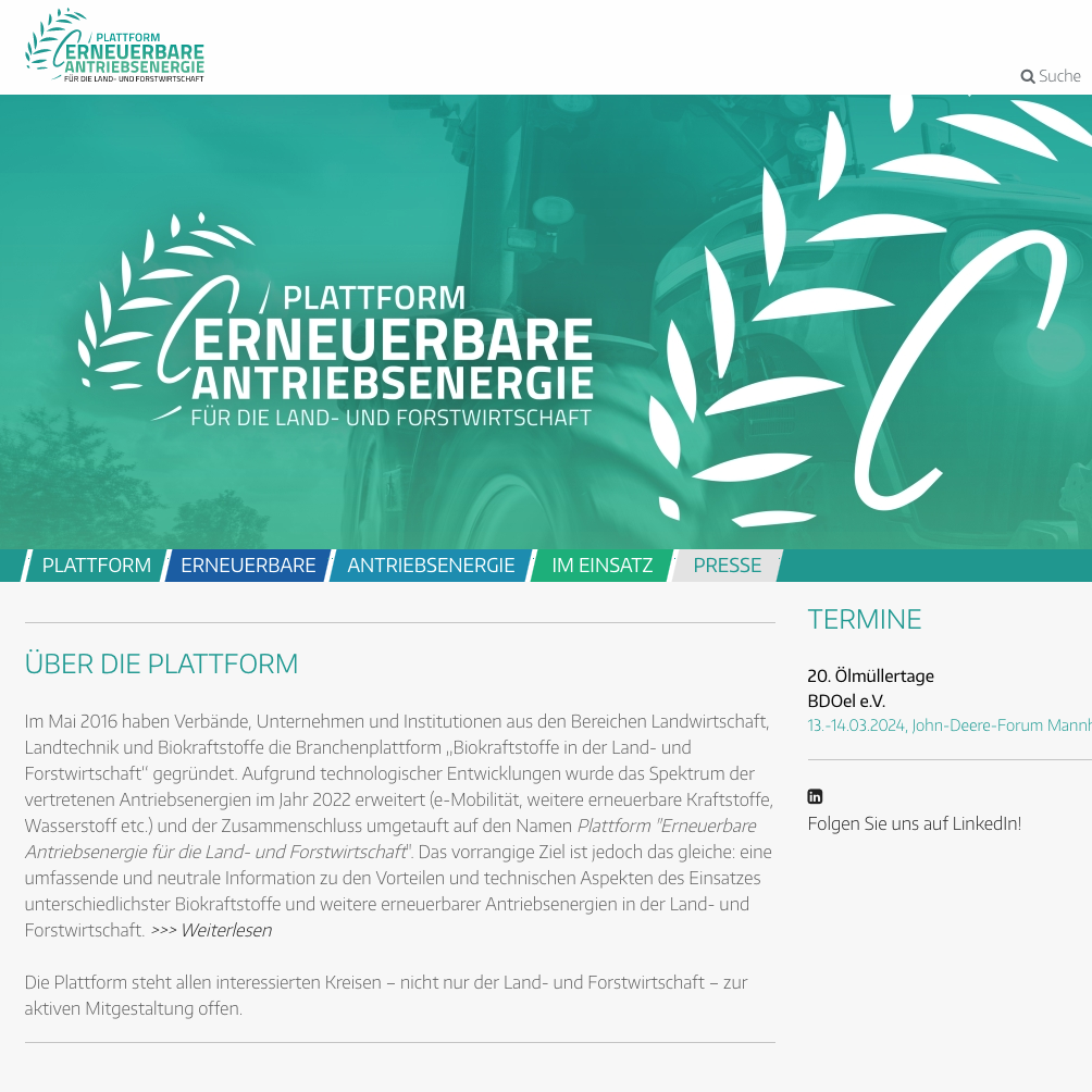 Durch die Erweiterung um elektrische und gasförmige Antriebsenergien für die Land- und Forstwirtschaft wurde 2022 aus der „Branchenplattform Biokraftstoffe in der Land- und Forstwirtschaft“ die Plattform „Erneuerbare Antriebsenergie für die Land- und Forstwirtschaft".