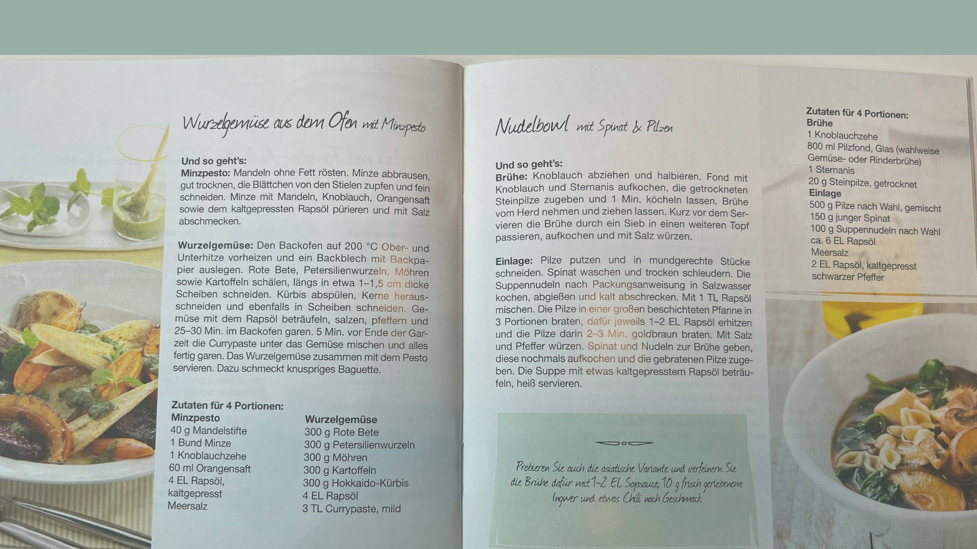 Schnell, raffiniert, lecker – so möchte man heutzutage kochen und backen. Und genau das ist das Motto der von WPRC für die Union zur Förderung von Oel- und Proteinpflanzen e. V. (UFOP) entwickelten Rezeptbroschüre „RapsölKüche“.