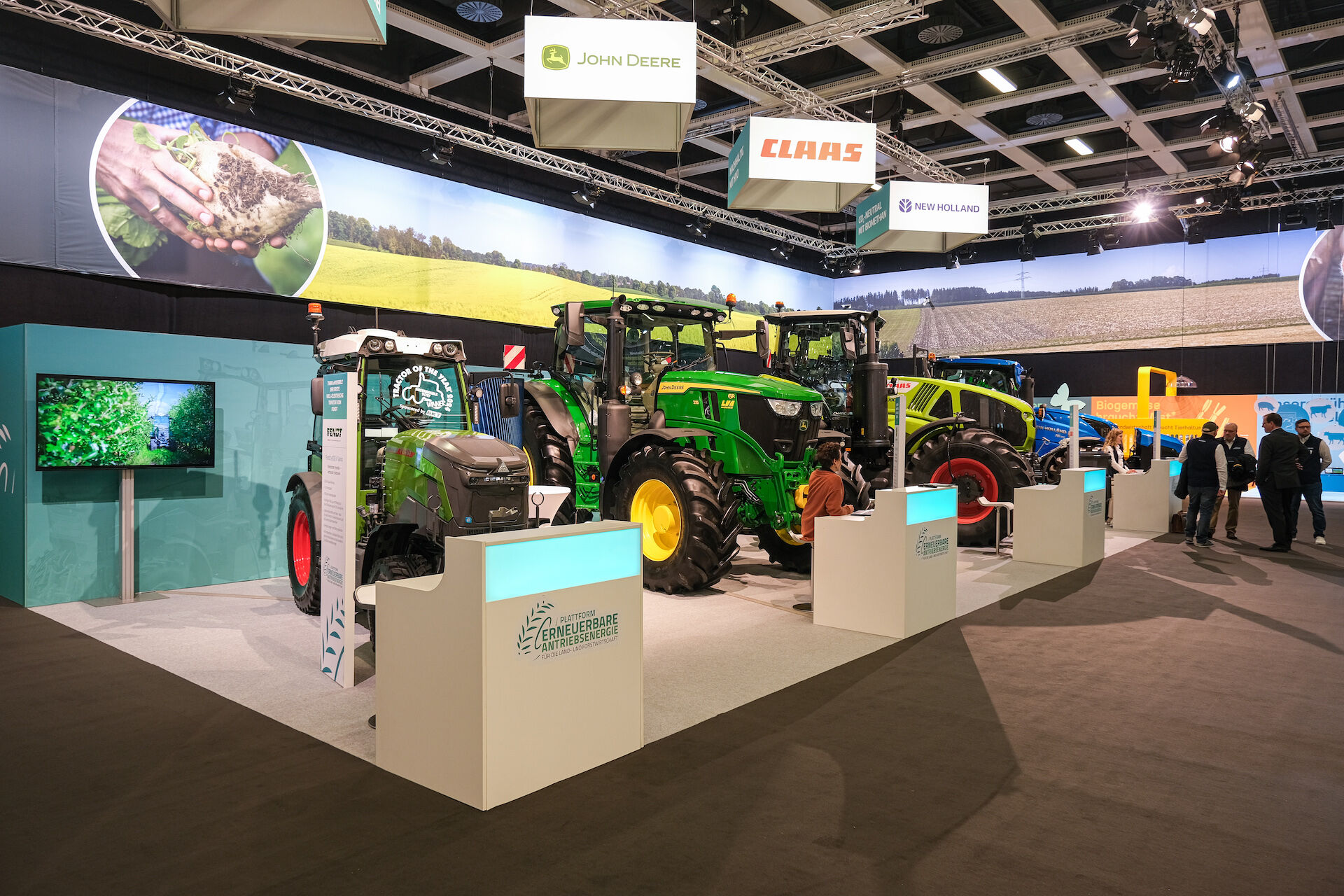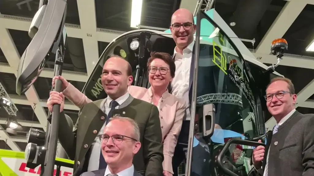 Landwirtschaftliche Fahrzeuge können klimaneutral betrieben werden, wenn man auf erneuerbare Antriebe setzt. Die „Plattform Erneuerbare Antriebsenergie für die Land- und Forstwirtschaft“ präsentiert daher auf der Grünen Woche vier Schlepper mit nichtfossilen Kraftstoffquellen. Neben erneuerbaren Flüssigkraftstoffen wie Pflanzenöl und HVO sind Biomethan ebenso wie Elektro zukunftsweisende Konzepte, die bereits heute einsatzfähig sind. Am Stand informierten sich Bundesminister, Vertreter von Bundes- und Landesministerien sowie viele Bundestagsabgeordnete und Landesvertretende über das technisch Mögliche und diskutierten das politisch Machbare.